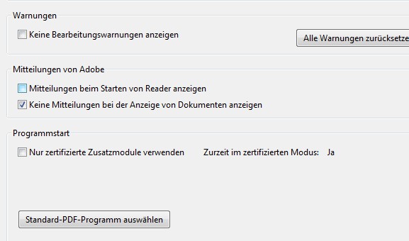 Remove only the check mark for "do not Embed in Internet Explorer" if you are using Adobe Reader in Internet Explorer. With a click on "Optimize" the settings displayed. At the latest now Adobe Reader should have no start-up difficulties and more. If, contrary to expectations, problems should arise, you can make the settings with a click on "Restore" to undo.