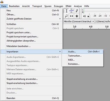 - Insert file: For a good quality of the Audio file should be in WAV. But also a high quality MP3 file, you can use. Unusual formats should you previously convert. Then, move the file by Drag&Drop it into Audacity, or add Import "file">"".