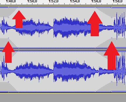 Even more precisely, you can adjust the "Envelope tool" from the tool the volume of the box: With the mouse you put the points that you raise the volume and can reduce.
