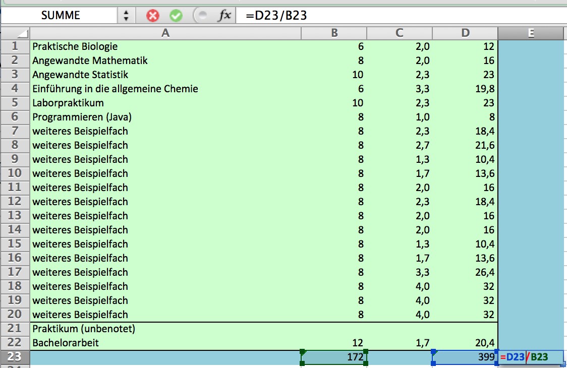 - Finally, in the fifth column of the same row the formula "=D23/C23". The result gives the current grade average and a full list of grades of your bachelor grade from.