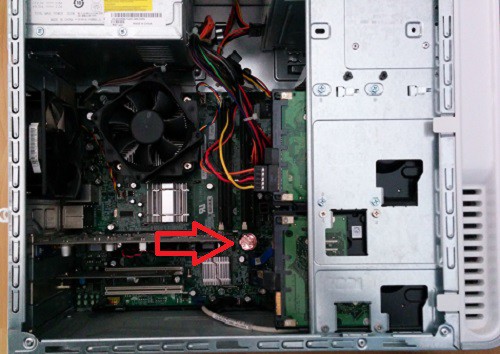 - Open the cover of your PC and remove the BIOS battery. It is the flat button cell is usually located in the center of the motherboard (see image).