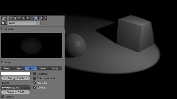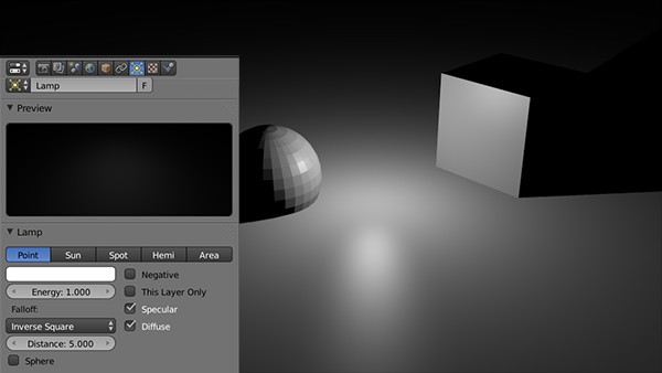 - Point Light: The Point Light illuminates the surroundings of the light in a constant Radius, similar to a light bulb. In the light settings on the right side of Blender you can set the color, the Radius (Distance) and the brightness of the light.