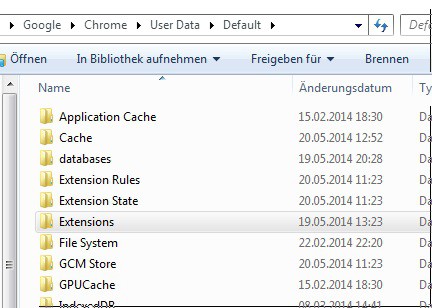 - On your Chrome Extensions you can now access the folder "c:\users\ihr_name\appdata\local\google\chrome\user Data\Default\Extensions".