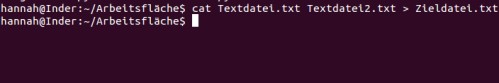 - Type in for example "cat textdatei.txt textdatei2.txt > zieldatei.txt" in the console, created Linux in the same directory the new target file. The other two Files remain and are not deleted. The file that you name in the command, first of all, the beginning of the target document.