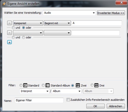 - The Filter can now be adjusted according to your Wishes. The choice is large: you can't put as a category for the Filter only by Genre, artist, length, or title name, but also on the little criteria such as the bit rate (kpbs), Beats per Minute (BPM) and file size into account.