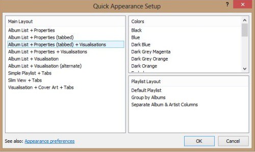 - After the first Start, the window "Quick Appearance Setup will appear, select" in which you the program's interface, the colors and the Layout of the playback list (Playlist). You can click through the options and see directly in the preview window. Then confirm your selection with "OK".