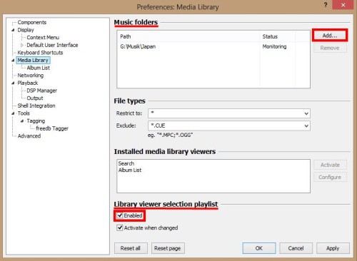 - If you want "foobar2000" always displays a playback list with the currently selected entry in the media library under the "Library viewer selection playlist" set the checkmark for "Enabled". This simplifies then the playback of the music considerably.