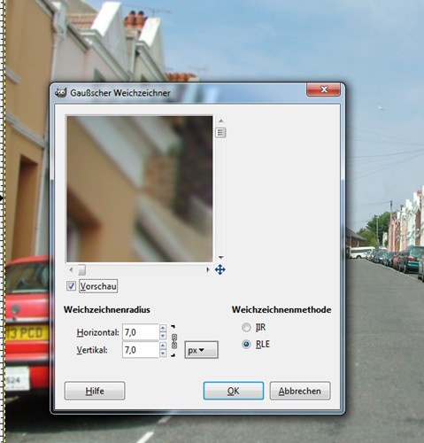 - Select in the menu bar "Filter" and click "blur" to "Gaußschner blur". In the next window, both "Horizontally" and "Vertically" to the value 7. Confirm by clicking "OK".
