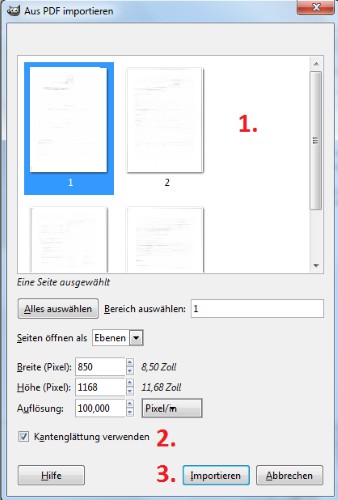 - Here you can select the sections and pages that you want to import into GIMP.