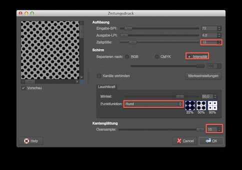 - The gray level of the hole to Distort with the menu "Filter - > - > newspaper". The cell size we have set at 15 px and to the intensity of the separated. You can also choose an angle of 50 degrees, a round-point function and in the case of edge smoothing, an Oversample of 15. Confirm the input.