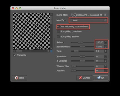 Next, you should deepen the structure. This is accessible via "Filter -> Map -> Bump Map". You choose the Map type to linear and set the check mark for "blackout compensate for the" azimuth should be set to 135, the elevation angle to 45, the depth to 10 and the atmosphere at 255, everything else at 0. You should confirm the settings.