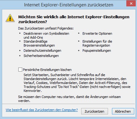 - Now click on "Reset..." to reset Internet Explorer. Select the "delete Personal settings" and confirm with "Reset".