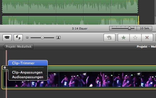 - To change the Start - and endpoint of the background music, click on the small Gear at the front end of the inserted piece of music, and select from the Drop-Down menu to trim the entry "Clip".