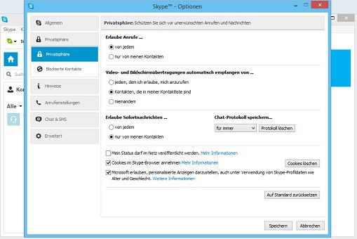 - First, you should check the settings of the Software. To do this, click the tab "actions" and finally to "options". There are numerous setting options for your "Skype". Especially important is the item "privacy": Here you set the check mark of who you call and who is allowed to send you messages.