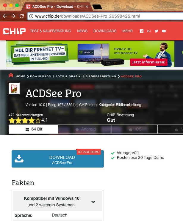 ACDSee Pro is with a free Demo available for Windows. For was 57.95 Euro the program is available in the full version.