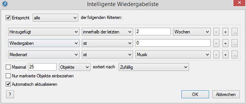 As an example, we want a smart playlist, which shows all unplayed and new Songs of the last two weeks.
