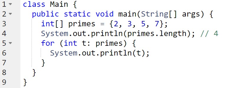 - In Java there is also a feature called "Enhanced For Loop". The first step is to declare a Variable, which is compatible with the data type of the array. This Variable is inserted in the for command. The value of the Variable is equal to the value of the current Array element. So you can leave all the values of an array in a row to spend. An example of the Code "int[] primes= {2, 3, 5, 7}would be;" ⮩ "for(int t: primes) {" ⮩ "System.out.println(t);" ⮩ "}".