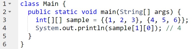 - The command "int[][] sample = {{1, 2, 3}, {4, 5, 6}};" creates an Array which contains two Arrays. The Command "System.out.println(sample[1][0]);" returns the value 4.