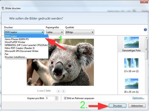 - The print preview opens. Select "printer" from the drop-down menu to the "PDFCreator" and click again on "Print".