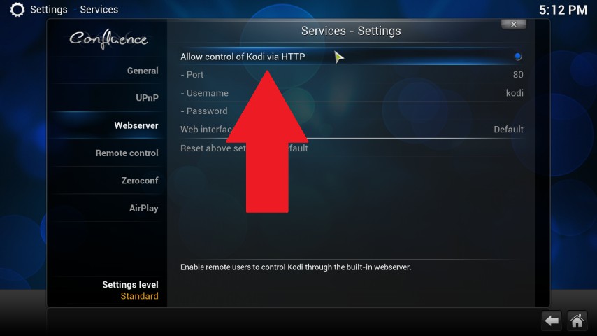 - Here you can enable the very top Option "Allow control of Kodi via HTTP".