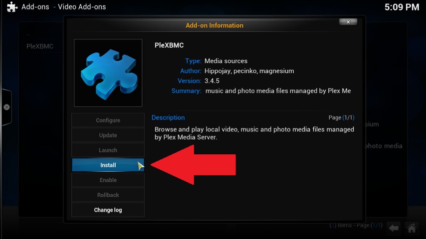 - Open the "Video Add-Ons", click on "PleXBMC", and select the Option "Install".