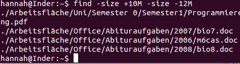 - In our example (see picture), we "find -size +10M -size -12M" is selected. Linux detects the type of files that are between ten and twelve megabytes in size.