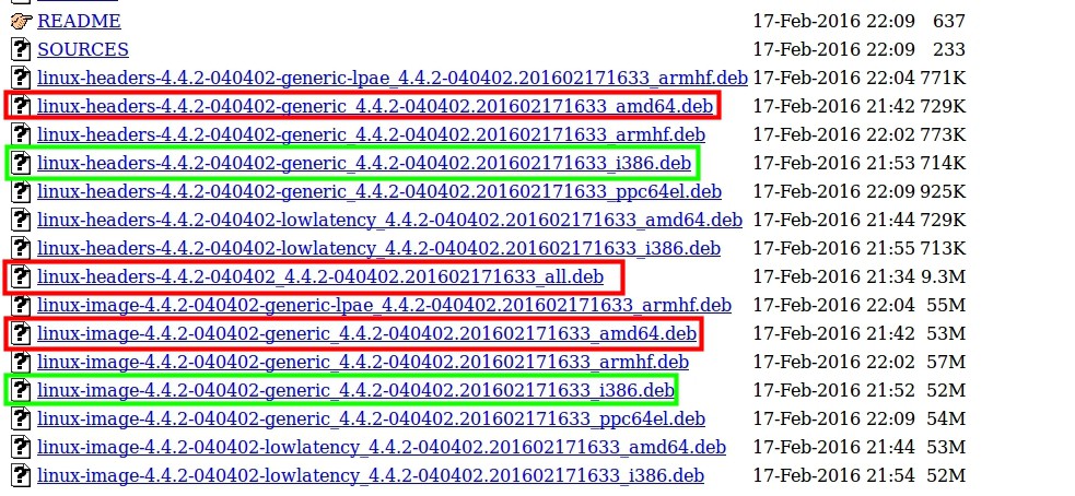 - Kernel files: In the opened folder select the following files to Download "linux-headers-*-generic-*_amd64.deb" and "linux-image-*-generic-*_amd64.deb" for 64-bit systems and "linux-headers-*-generic-*_i386.deb" and "linux-image-*-generic-*_i386.deb" for 32-bit systems. In any case, download the "linux-headers-*_all.deb"-file. On the picture you can see the needed files on the example of the 4.4.2 kernel (green = 32bit). Save the files on your Computer (e.g. Downloads folder).