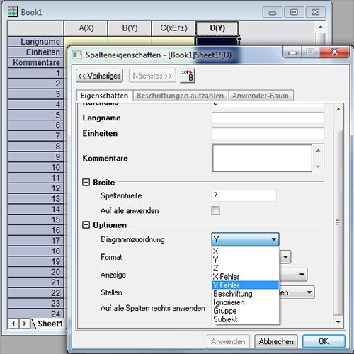 - About "long name" and "units" set the label of the respective axis. For example, you can enter the weight here "mass" and "kg".