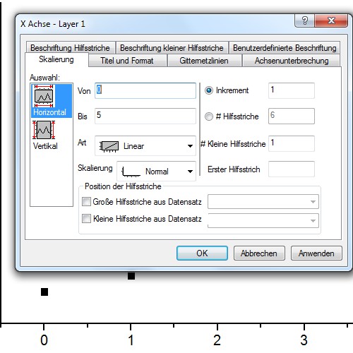 - Now you can set in the fields "From" and "To" which area should be visible. With "increment" to specify the interval, in which a new value on the axis shows should be. You want to scale one axis is logarithmic, change "type" to "ln".