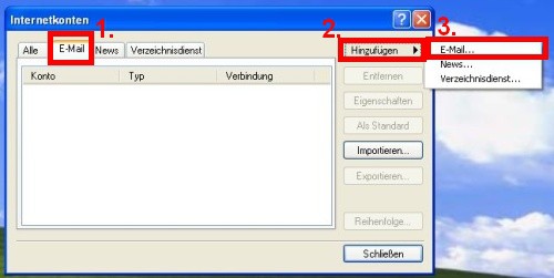 - Select the tab "E-Mail" and click "Add" and then "E-Mail...". It is the Internet connection wizard opens.