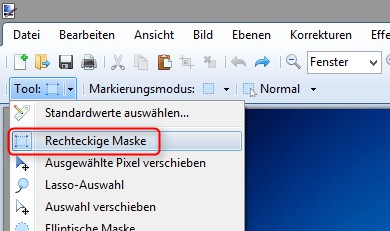 - Click in the menu bar, click "Tool - rectangular mask," or in the Toolbox on the Icon in the top left.