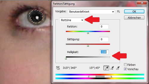- Choose the Reds and move the brightness slider to the left to -100.
