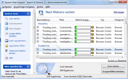 - Click on the Button 'start Scan' is checked for your complete System, Spy - and Adware. This process can take time depending on the disk space used on your hard drive and speed up your computer, 10 to 60 minutes.