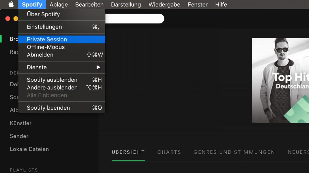 - On the conventional Spotify Version for Desktop computers, please click on the "file" or "Spotify" under macOS, and on "Private Session".