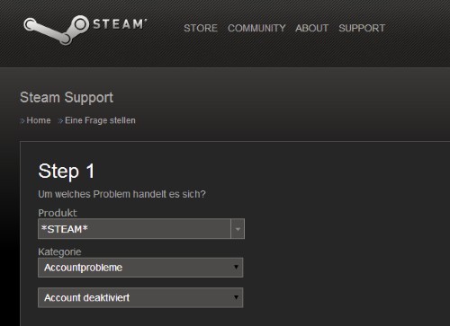 - Select the request as the product of "Steam" and as a category of "account problems" as well as "Account disabled".