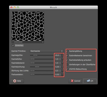 - In the next step, you will create a new layer and fill it black. Open the menu "Filter -> Distort -> mosaic" and set the values according to the Screenshot in the picture gallery a.