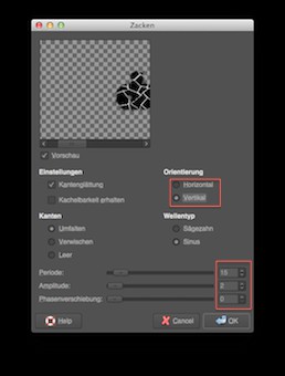 - To bring a bit of unrest in the mosaic, navigate to Distort "Filter - > - > PIP". As a setting, you can select "edge smoothing", "Horizontal", "Folding" and "sine". The period should be 15, the Amplitude is 2 and the phase shift 0. Confirm the setting and repeat the PIP Filter, but this time set it to "Vertical" instead of "Horizontally"..