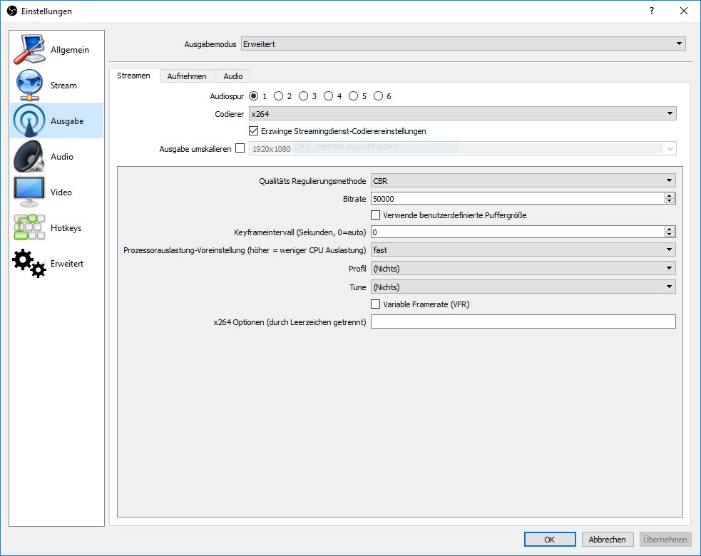- Select in the settings for "Stream" as the platform, "Twitch" and fill in your personal stream key, which you can use to your Twitch Dashboard, under the tab "Stream Key" find.