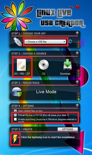 - Next, start the "Linux Live USB Creator". Under "step 1" select your USB drive with the assigned drive letter.