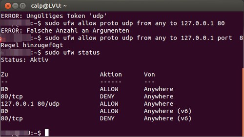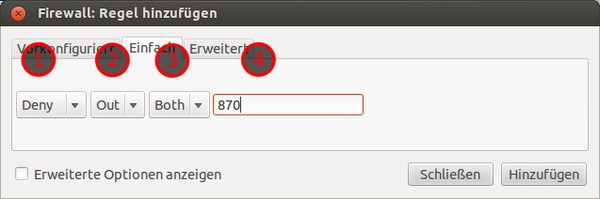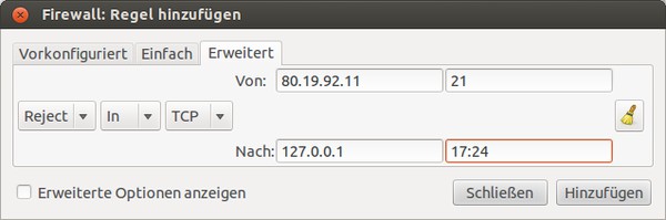 Special Firewall rules set with the UFW under "Advanced". In the example, all TCP will be rejected packets are to be transmitted via the Port 21 to the IP address 80.19.92.11 via one of the Ports from 17 to 14 (Port-Range with a PortA:PortB) to the home computer.