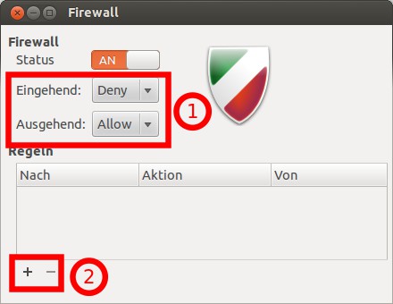 (1.) Here you can set the global Firewall settings for incoming/outgoing Connections. (2.) On "+" to add a new rule, using "-" to remove an existing one.