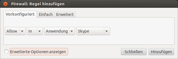 Under "pre-configured", you can configure Firewall rules for some Standard applications and Services. In this example, incoming Connections from "Skype" are accepted generally.