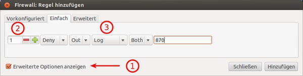 (1) click on "show Advanced options" is selected two additional fields: (2) Here you define a number for the respective rule. (3) Here, you configure whether the Firewall actions will be logged under this rule.