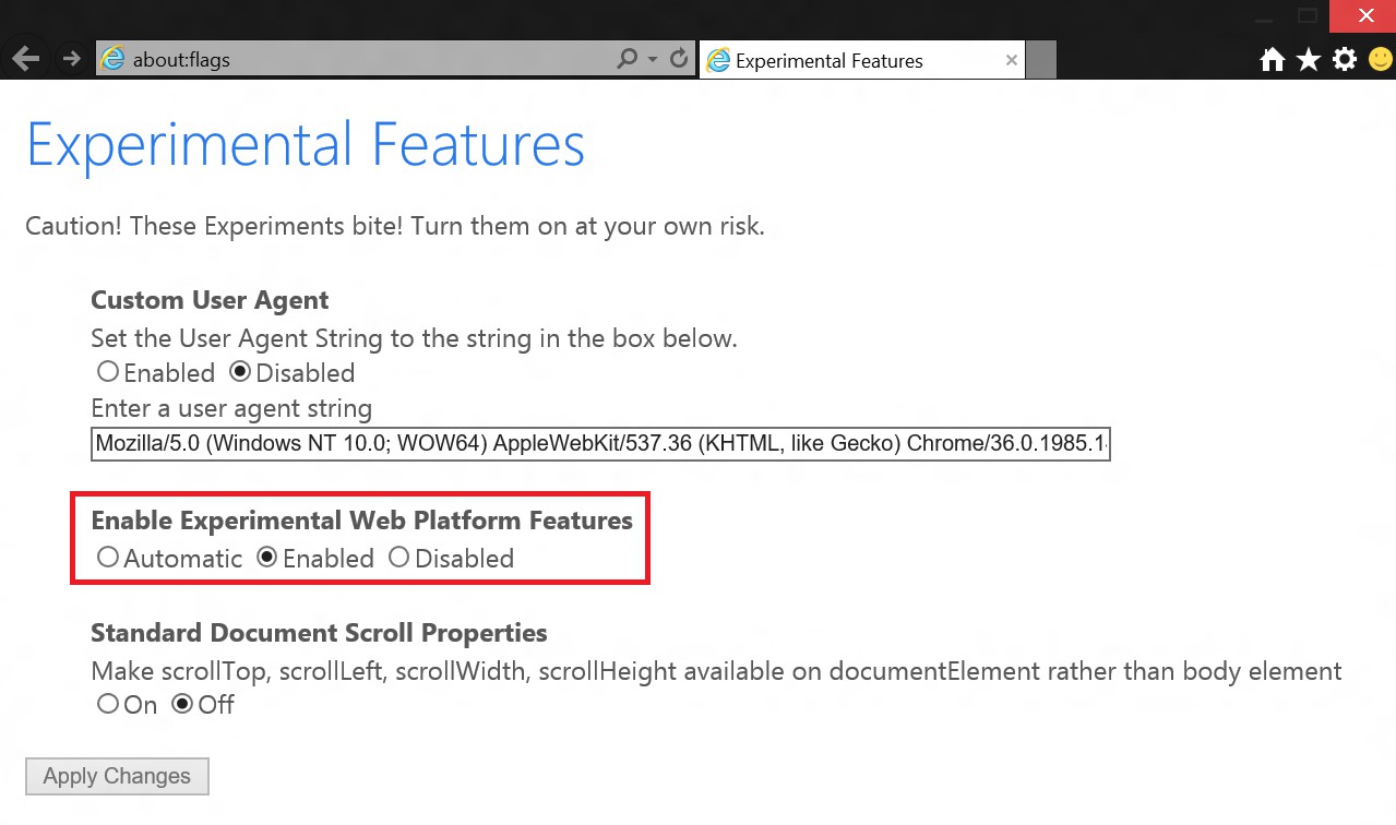 - Under the category of "Enable Experimental Web Platform Features" change the Option to "Enabled".