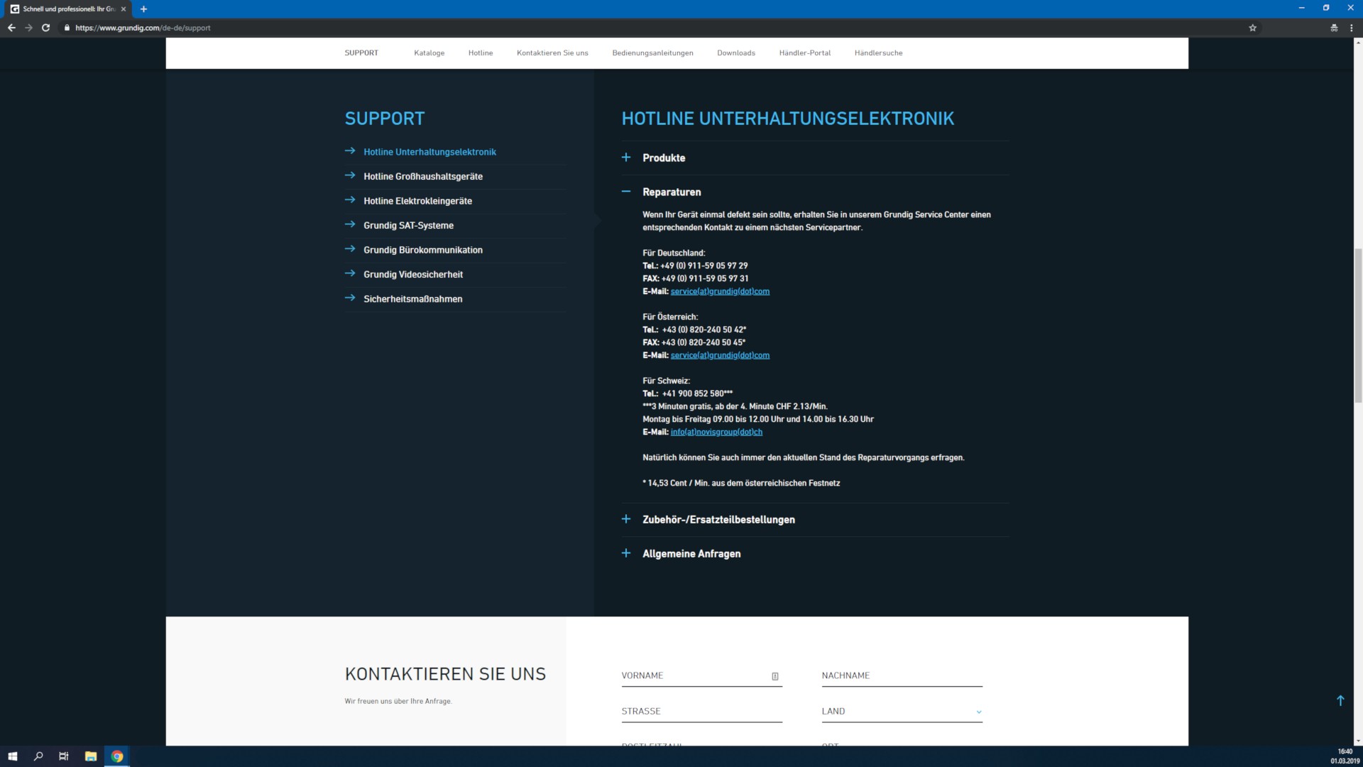 - Open the Support website of Grundig and click on "contact us".