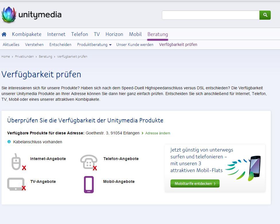 - After clicking on "check availability" you will get an Overview of the services offered by Unitymedia at their place of residence.