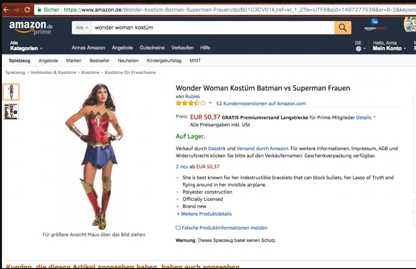Wonder Woman costume on Amazon