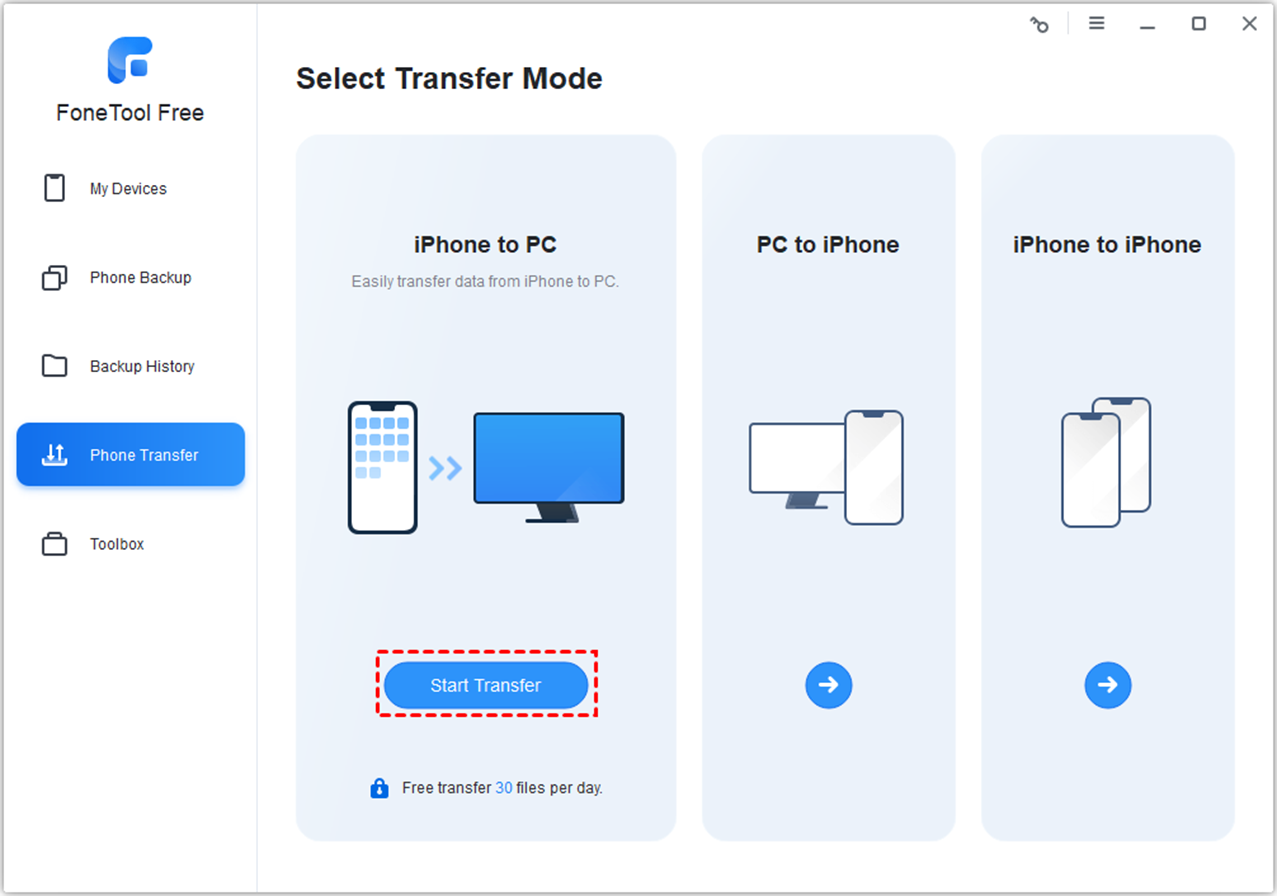 Step 2. Launch FoneTool > Navigate Phone Transfer on the left pane > Choose iPhone to PC > Click Get Started.