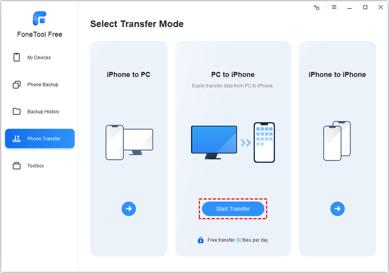 Step 2. Open FoneTool > Tap Phone Transfer > Mouse over to PC to iPhone > Click Start Transfer.