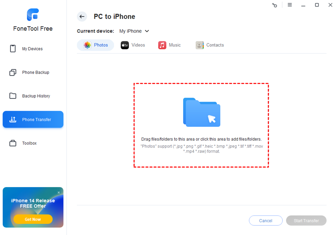 When AirDrop can’t help you share data from iPhone to Windows PC, why not choose another AirDrop Alternative? FoneTool is a professional and free cross-platform data transfer tool, it is specially designed to help you quickly share files between iPhone and Windows. It provides a user-friendly and intuitive interface that enables you to easily transfer files such as photos, videos, music, contacts, etc. from iPhone to Windows PC and vice versa.